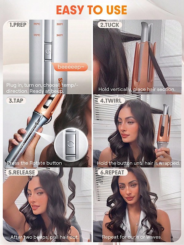 نحوه استفاده: دستگاه را روشن کرده و دمای مناسب را تنظیم کنید. / قسمت های کوچک از موها را داخل لوله دستگاه قرار دهید. / دکمه “One-Touch” را فشار دهید تا دستگاه به طور خودکار موها را دور لوله پیچیده و فر کند. / پس از چند ثانیه با شنیدن صدا بوق، فر موی شما آماده است.