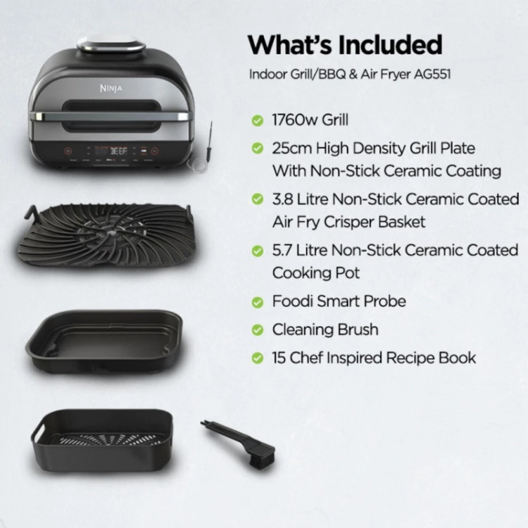 کبابپز Ninja Foodi Smart XL که چیپسها را سرخ میکند، میپزد و با تکنولوژی هواپز طبخ میکند. نسل دوم با طراحی شیک جدید با سیستم آشپزی هوشمند و ظرفیت XL، به وعدههای غذایی پرجمعیت خانواده با فشار دادن یک دکمه به پخت کامل، از rare تاwell done، دست پیدا کنید. گریل NINJA FOODI SMART با عملکرد ۶ در ۱ شامل:۶ عملکرد پخت و پز همه کاره ازجمله Grill, Air Crisp, Roast, Bake, Broil, and Dehydrate با طیف وسیع دما فعال شده است.از دیگر ویژگی های جذاب این دستگاه که آنرا تبدیل به یک انتخاب مناسب برای کسانی که وقت زیادی ندارند کرده ویژگی تمیز کردن آسان آن است صفحه گریل با روکش سرامیکی، قابل جدا شدن، سبد و قابلمه پخت و پز همگی قابل شستشو در ماشین ظرفشویی هستند و به راحتی تمیز می شوند. کباب پز با ظرفیت بالا که دقیقاً با نتایج عالی پخت می شود بیش از یک گریل –با ۶ عملکرد پخت: سرخ کردن با هوا، پختن، برشته کردن، گرم کردن مجدد، آبگیری و گریل کردن سیستم آشپزی هوشمند - کاوشگر پخت دیجیتالی به شما امکان میدهد بدانید چه زمانی غذای شما کاملاً پخته شده است، دقیقاً همانطور که دوست دارید، غذای سرخ شده تا ۷۵ درصد چربی کمتر نسبت به روش های سرخ کردنی سنتی می باشد ، شامل قابلمه ۳.۸ لیتری، سبد کری سپر ۳.۸ لیتری، بشقاب گریل ۷۴۰ سانتی متری مربعی، برس تمیزکننده، راهنمای دستور پخت آشپز است. قطعات قابل شستشو در ماشین ظرفشویی سیستم آشپز هوشمند کاوشگر پخت دیجیتال دقیقاً دمای غذای شما را در حین پخت نظارت می کند، بنابراین نیازی به این کار ندارید! از موارد کمیاب تا خوب انجام شده، پایان خود را انتخاب کنید و گوشت و ماهی مورد علاقه خود را با کاوشگر در جای خود بپزید. هشدارهای صوتی به شما اطلاع میدهند که چه زمانی آماده برداشتن و استراحت قبل از ارائه است. بیشتر از یک گریل با ۶ کارکرد پخت و پز - سرخ کردنی در هوا، پختن، برشته کردن، آبگیری، گرم کردن و گریل کردن، غذاها و میان وعده های خوشمزه را برای کل خانواده ایجاد کنید. بدون نیاز به تلنگر با فناوری Cyclonic Air. از یخ زده بپزید. بشقاب گریل بزرگ ۷۴۰ سانتی متر مربعی تا ۶ همبرگر مناسب است. شامل قابلمه ۳.۸ لیتری و سبد کریسپر ۳.۸ لیتری. قابلیت میوه خشکن کن، سرخ کن ، گریل کردن و پخت و پز را دارد ، طول سیم ۹۰ سانتی متر ، بدنه ضدزنگ ، ولتاژ ۱۲۰ ولت ، آمپر ۶۰ آمپر ، توان ۱۷۶۰ وات ، قابل شستشو در ماشین ظرفشویی را دارد .