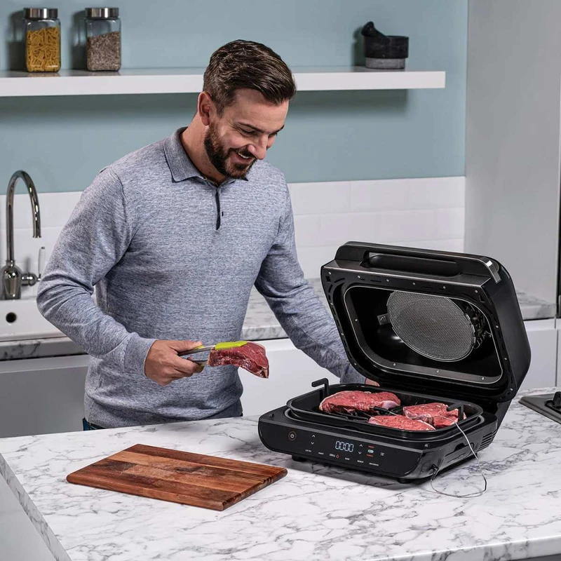 کبابپز Ninja Foodi Smart XL که چیپسها را سرخ میکند، میپزد و با تکنولوژی هواپز طبخ میکند. نسل دوم با طراحی شیک جدید با سیستم آشپزی هوشمند و ظرفیت XL، به وعدههای غذایی پرجمعیت خانواده با فشار دادن یک دکمه به پخت کامل، از rare تاwell done، دست پیدا کنید. گریل NINJA FOODI SMART با عملکرد ۶ در ۱ شامل:۶ عملکرد پخت و پز همه کاره ازجمله Grill, Air Crisp, Roast, Bake, Broil, and Dehydrate با طیف وسیع دما فعال شده است.از دیگر ویژگی های جذاب این دستگاه که آنرا تبدیل به یک انتخاب مناسب برای کسانی که وقت زیادی ندارند کرده ویژگی تمیز کردن آسان آن است صفحه گریل با روکش سرامیکی، قابل جدا شدن، سبد و قابلمه پخت و پز همگی قابل شستشو در ماشین ظرفشویی هستند و به راحتی تمیز می شوند. کباب پز با ظرفیت بالا که دقیقاً با نتایج عالی پخت می شود بیش از یک گریل –با ۶ عملکرد پخت: سرخ کردن با هوا، پختن، برشته کردن، گرم کردن مجدد، آبگیری و گریل کردن سیستم آشپزی هوشمند - کاوشگر پخت دیجیتالی به شما امکان میدهد بدانید چه زمانی غذای شما کاملاً پخته شده است، دقیقاً همانطور که دوست دارید، غذای سرخ شده تا ۷۵ درصد چربی کمتر نسبت به روش های سرخ کردنی سنتی می باشد ، شامل قابلمه ۳.۸ لیتری، سبد کری سپر ۳.۸ لیتری، بشقاب گریل ۷۴۰ سانتی متری مربعی، برس تمیزکننده، راهنمای دستور پخت آشپز است. قطعات قابل شستشو در ماشین ظرفشویی سیستم آشپز هوشمند کاوشگر پخت دیجیتال دقیقاً دمای غذای شما را در حین پخت نظارت می کند، بنابراین نیازی به این کار ندارید! از موارد کمیاب تا خوب انجام شده، پایان خود را انتخاب کنید و گوشت و ماهی مورد علاقه خود را با کاوشگر در جای خود بپزید. هشدارهای صوتی به شما اطلاع میدهند که چه زمانی آماده برداشتن و استراحت قبل از ارائه است. بیشتر از یک گریل با ۶ کارکرد پخت و پز - سرخ کردنی در هوا، پختن، برشته کردن، آبگیری، گرم کردن و گریل کردن، غذاها و میان وعده های خوشمزه را برای کل خانواده ایجاد کنید. بدون نیاز به تلنگر با فناوری Cyclonic Air. از یخ زده بپزید. بشقاب گریل بزرگ ۷۴۰ سانتی متر مربعی تا ۶ همبرگر مناسب است. شامل قابلمه ۳.۸ لیتری و سبد کریسپر ۳.۸ لیتری. قابلیت میوه خشکن کن، سرخ کن ، گریل کردن و پخت و پز را دارد ، طول سیم ۹۰ سانتی متر ، بدنه ضدزنگ ، ولتاژ ۱۲۰ ولت ، آمپر ۶۰ آمپر ، توان ۱۷۶۰ وات ، قابل شستشو در ماشین ظرفشویی را دارد .