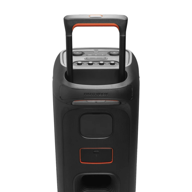 JBL PartyBox Stage 320 با در نظر گرفتن نیازهای مهمانیهای مدرن و لزوم جابجایی آسان طراحی شده است. بدنهی این اسپیکر از پلاستیک فشرده و مقاوم ساخته شده که دوام بالایی در برابر استفادههای مکرر و حمل و نقل دارد. با ابعاد ۳۳۵ در ۶۷۰ در ۳۸۵ میلیمتر و وزن ۱۶.۵ کیلوگرم، این دستگاه اگرچه بزرگ و قدرتمند است، اما به لطف دسته تلسکوپی محکم و چرخهای مقاوم و روان، حمل و نقل آن به طرز شگفتآوری آسان است. شما میتوانید به راحتی آن را مانند یک چمدان جابجا کرده و مهمانی خود را به هر مکانی، از حیاط خلوت گرفته تا کنار ساحل، منتقل کنید. گواهی IPX4 هم مقاومت این اسپیکر را در برابر پاشش آب از هر جهتی تضمین میکند. این ویژگی به شما اجازه میدهد تا بدون نگرانی از بارانهای ناگهانی یا پاشش اتفاقی آب در کنار استخر، از موسیقی و مهمانی خود لذت ببرید.