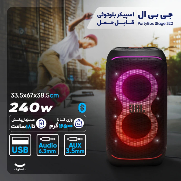 شرکت JBL همواره در زمینهی تولید تجهیزات صوتی پیشگام بوده و اسپیکرهای سری PartyBox آن، با صدای قدرتمند و باکیفیت، نورپردازیهای خیرهکننده و قابلیت حمل آسان، جایگاه ویژهای در میان علاقهمندان به موسیقی و مهمانی پیدا کردهاند. در نمایشگاه CES 2024، جیبیال از نسل جدید این اسپیکرهای محبوب رونمایی کرد و PartyBox Stage 320 به عنوان یکی از پرچمداران این خانواده، با هدف ارائهی تجربهای شنیداری و بصری بینظیر، پا به عرصه گذاشته است. این اسپیکر چمدانی، با توان خروجی ۲۴۰ وات، فناوری نوین AI Sound Boost، عمر باتری ۱۸ ساعته، مقاومت در برابر پاشش آب و امکانات اتصال متنوع، آماده است تا هر فضایی را به یک صحنهی اجرای زنده یا یک فستیوال پر انرژی تبدیل کند.