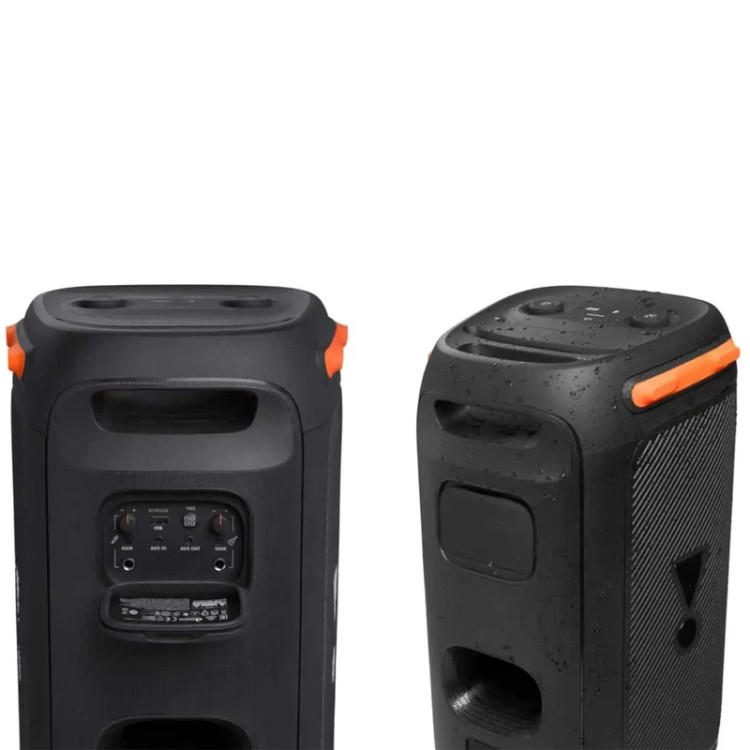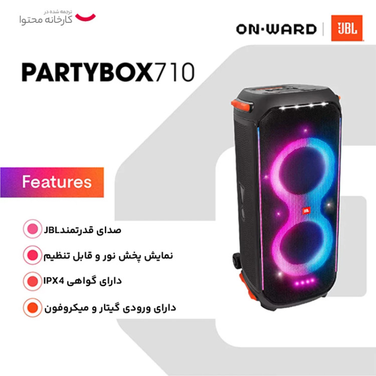 یک انتخاب عالی برای تجربه صدای قدرتمند و الگوهای نوری RGB در مکانهای داخلی و خارجی است. این اسپیکر بلوتوثی به دلیل قابل حمل بودن و وزن سبک، امکان حمل آسان را برای کاربران فراهم میکند. همچنین، با امکان اتصال به دستگاههای بلوتوثی، این اسپیکر امکان پخش موسیقی بیسیم را به کاربران ارائه میدهد. با توجه به قابل حمل بودن و توان صدای قدرتمند و همچنین الگوهای نوری جذاب، اسپیکر بلوتوثی قابل حمل جی بیال یک انتخاب عالی برای هر کسی است که به دنبال یک تجربه صوتی و بصری منحصر به فرد است. این اسپیکر با ابعاد 43.9 سانتیمتر و وزن 27000 گرم است. اسپیکر بلوتوثی قابل حمل JBL Partybox 710 یک اسپیکر بلوتوثی بسیار قدرتمند با توان خروجی 800 RMS وات، این اسپیکر توانایی پخش صدای قوی و واضح را داراست که منجر به تجربه صوتی فوقالعادهای میشود. یکی از ویژگیهای منحصر به فرد این اسپیکر، امکان اتصال به دو دستگاه بلوتوثی به صورت همزمان است. این ویژگی به کاربران این امکان را میدهد که به صورت همزمان از دو دستگاه مختلف موزیک پخش کنند و از تجربه گوش دادن به موسیقی با کیفیت بالا لذت ببرند. JBL Partybox 710با کیفیت صدای بالا و پخش موسیقی با جزئیات دقیق، تجربهای فوقالعاده از نظر صوتی برای کاربران ارائه میدهد. همچنین با پخش نورهایRGB، تجربه بصری همراه با گوش دادن به موسیقی، بیشترین لذت را برای .کاربران فراهم میکند. اسپیکر جی بیال Partybox 710 بهطور خاص طراحیشدهاست تا بتواند به خوبی در فضاهای داخلی و خارجی استفاده شود. این اسپیکر با قدرت صدای قوی و طراحی ارگونومیک، انتخاب بسیار مناسبی برای افرادی است که به دنبال یک اسپیکر قدرتمند و قابل حمل برای استفاده در فضاهای مختلف هستند.
